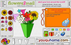 在线感受插花的艺术 一个打发时间的网站,用flash制作的模拟插花游戏,花束、花瓶、装饰应有尽有,插好后,可以写上祝词发给好友,也可以设定朋友生日那天自动将你亲手插的花发给他/她~!传送门 http://www.flowers2mail.com/传送门