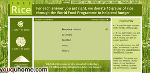 非常有意义的公益网站-英语换大米 这是一个公益性网站,用简单的答题方法就可以为穷困地区捐助粮食,答对一题网站就像穷困地区捐助10粒大米,不要小看哦,积少成多的例子数不胜数,截止到今天,这个网站已经向穷困地区捐助了73,817,846,130粒大米,约合2839吨(一两大米约2600粒),懂英文的朋友去看看吧,即练习又公益,何乐而不为呢~!